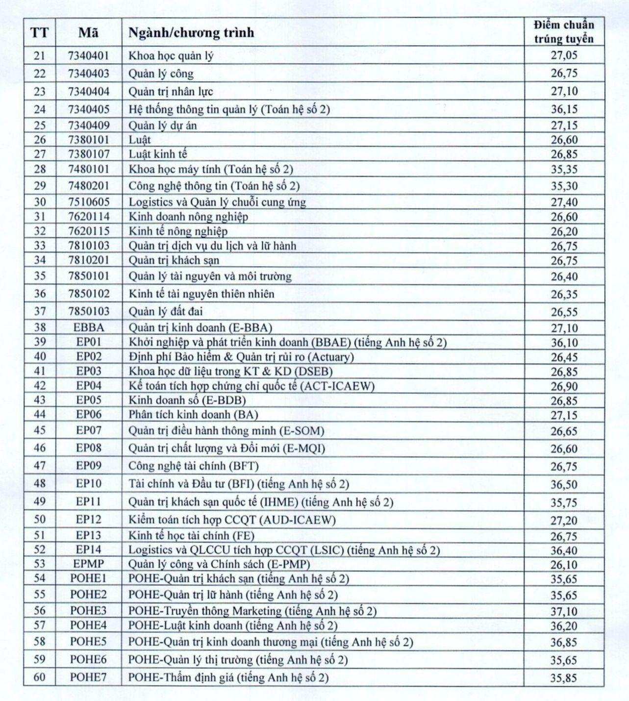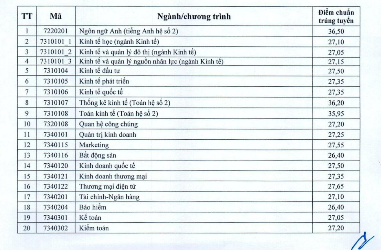 Điểm chuẩn cụ thể các ngành của Trường Đại học Kinh tế Quốc dân như sau: