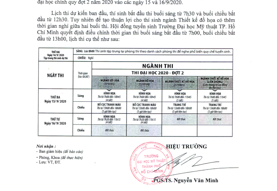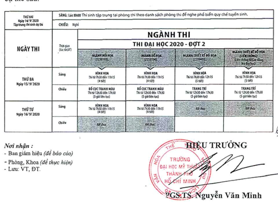 Ngày 12/9, Trường ĐH Mỹ thuật TPHCM cũng đã chính thức có thông báo điều chỉnh lịch thi năng khiếu đợt 2. “Lịch thi dự kiến ban đầu, thí sinh bắt đầu thi buổi sáng từ 7h30’ và buổi chiều bắt đầu từ 12h30’. Tuy nhiên để tạo thuận lợi cho thí sinh ngành Thiết kế đồ họa có thêm thời gian nghỉ giữa hai buổi thi, Hội đồng tuyển sinh Trường ĐH Mỹ thuật TPHCM quyết định điều chỉnh thời gian thi buổi sáng bắt đầu từ 7h00, buổi chiều bắt đầu từ 13h00…” thông báo của trường nêu.