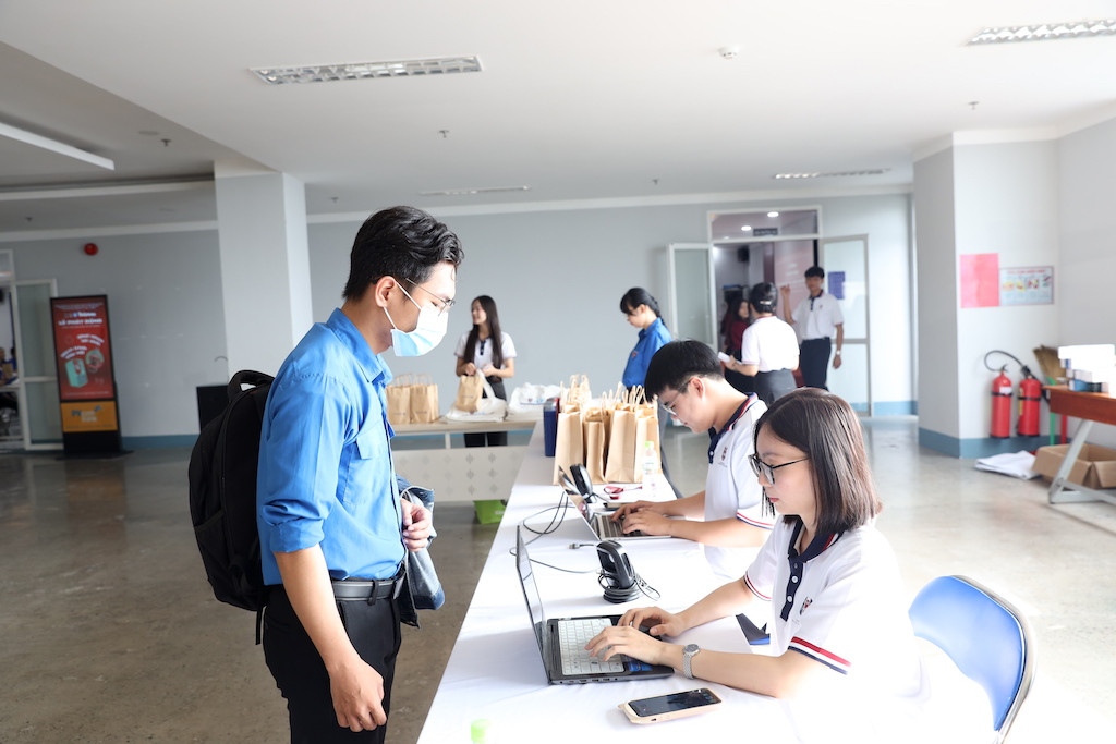 | Sinh viên Trường Đại học Ngân hàng TP. HCM xếp hàng đăng ký tham gia chương trình. |