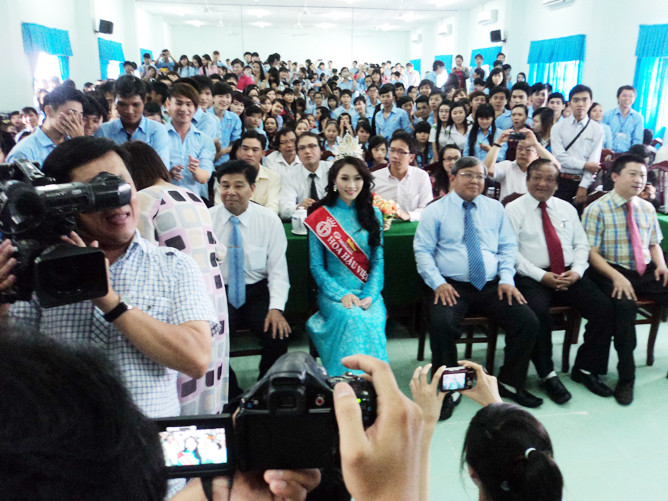 Chuyển vị trí ngồi để nhiều sinh viên được ngắm Hoa hậu.