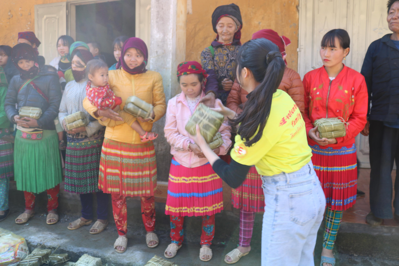 | Các bạn sinh viên trao bánh chưng tới những hoàn cảnh khó khăn, thiếu thốn, cùng 1 suất quà nhỏ nhưng ý nghĩa, với hy vọng những hoàn cảnh khó khăn ấy có được 1 cái Tết ấm no hơn. |