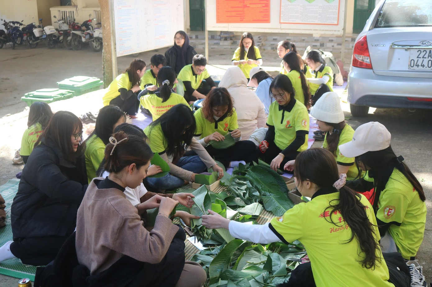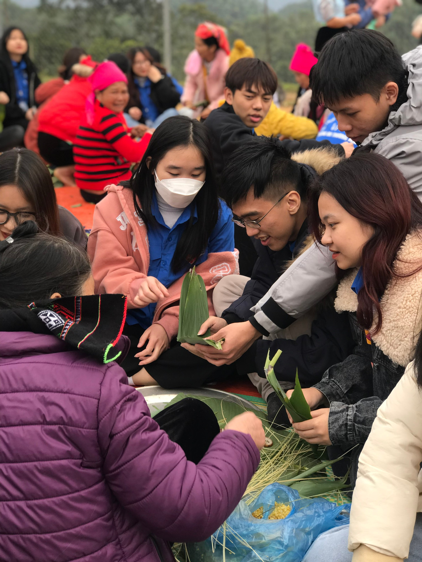 | Các sinh viên Trường Đại học Thương mại gói Bánh chưng trong chuỗi hoạt động Chương trình Đông Ấm 2023. |