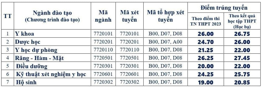 Theo đó, ngành Răng - Hàm - Mặt có điểm chuẩn cao nhất ở cả hai phương thức. Trong đó, phương thức xét kết quả thi tốt nghiệp là 26,25/30 điểm, phương thức xét kết quả học bạ là 27,45 điểm.