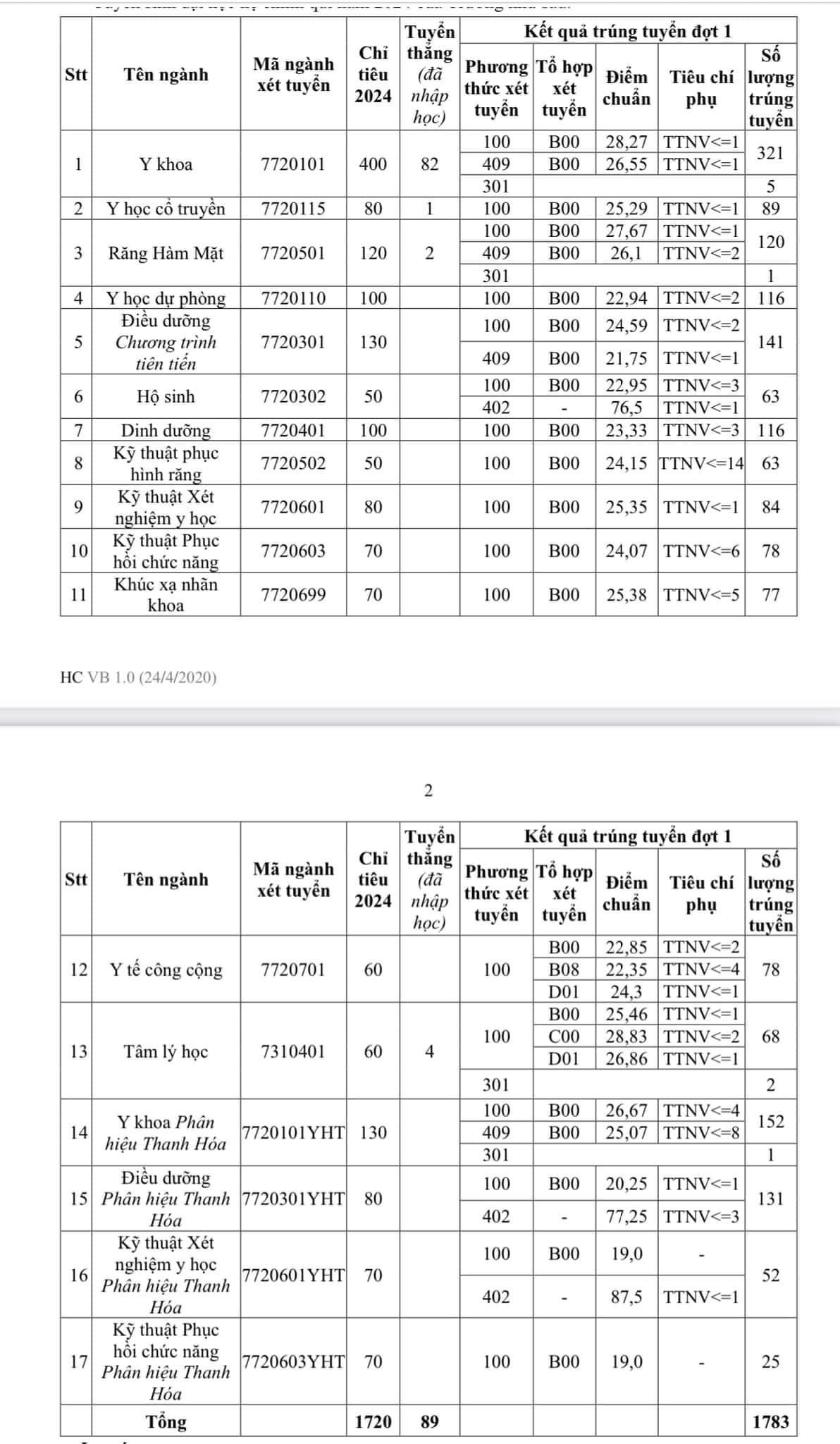 Điểm chuẩn cụ thể của Trường Đại học Y Hà Nội như sau: