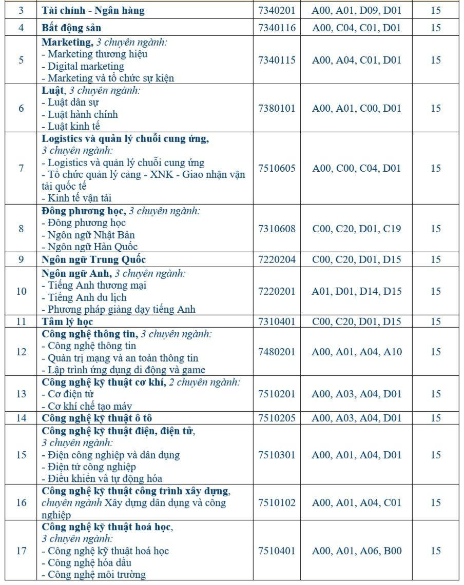 Theo đó, ngành Điều dưỡng: Bằng điểm sàn theo quy định của Bộ Giáo dục và Đào tạo. Các ngành còn lại: 15 điểm.