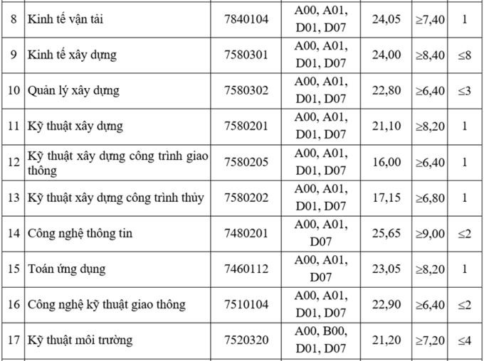 Năm 2020, điểm trúng tuyển vào trường ĐH Giao thông Vận tải từ 16,05 đến 25 điểm, trong đó ngành Logistics và Quản lý Chuỗi cung ứng ở cơ sở Hà Nội lấy cao nhất. Kế đến là ngành Công nghệ thông tin 24,75 và Kỹ thuật Ô tô 24,55 điểm.