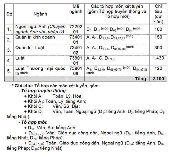 Cụ thể như sau: môn văn, toán xét tuyển thẳng vào ngành quản trị - luật, ngành quản trị kinh doanh, ngành luật, ngành luật thương mại quốc tế và ngành ngôn ngữ Anh. Môn tiếng Anh: ngành quản trị - luật, ngành quản trị kinh doanh, ngành luật, ngành luật thương mại quốc tế và ngành ngôn ngữ Anh. Môn tiếng Nhật và tiếng Pháp: ngành quản trị - luật, ngành quản trị kinh doanh, ngành luật và ngành luật thương mại quốc tế. Môn lý, hóa: ngành quản trị - luật, ngành quản trị kinh doanh, ngành luật. Môn sử: ngành luật và ngành ngôn ngữ Anh. Môn địa: ngành luật.