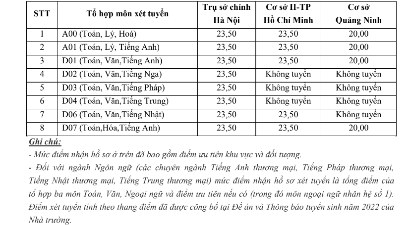 Theo đó, tại trụ sở chính Hà Nội, mức điểm sàn nhận hồ sơ xét tuyển dựa trên kết quả thi tốt nghiệp THPT năm 2022 (phương thức xét tuyển 4) các tổ hợp xét tuyển: A00, A01, D01, D02, D03, D04, D06, D07, thí sinh phải đạt điểm thấp nhất là 23,50 điểm mới đủ điều kiện xét tuyển.