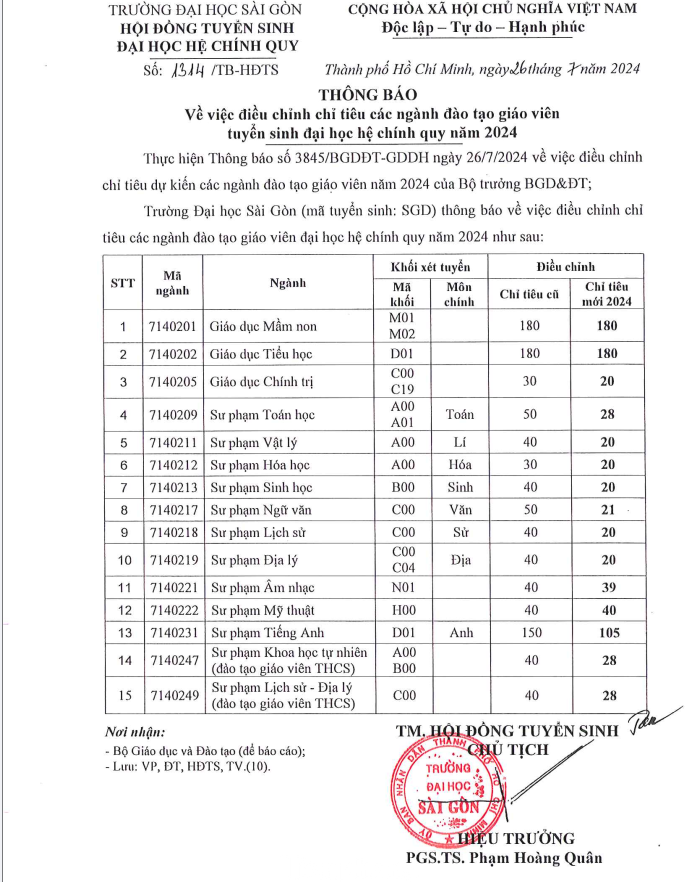 Trường ĐH Sài Gòn vừa có thông báo điều chỉnh chỉ tiêu tuyển sinh các ngành sư phạm năm 2024.