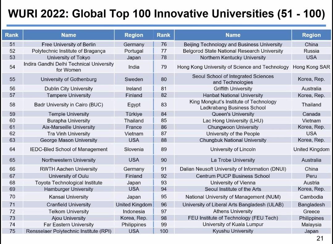 Tại hội nghị trực tuyến do Liên minh các trường đại học thế giới, World’s Universities with Real Impacts (WURI) vừa công bố Trường Đại học Trà Vinh xếp hạng 62 trong Top 100 của WURI Ranking 2022 trường có ảnh hưởng và đóng góp tích cực cho xã hội. Đồng thời, xếp thứ 15 (tăng 2 bậc so với trước đây) lọt vào trong Top 50 về giá trị của khởi nghiệp, đổi mới sáng tạo, hạng 47 trong Top 50 về mở rộng hợp tác và trao đổi sinh viên quốc tế, cơ hội giao lưu học tập sinh viên giữa các cơ sở giáo dục ngoài nước và xếp hạng 22 trong Top 50 về kết nối mở, chuyển đổi số và các ứng dụng tích hợp.