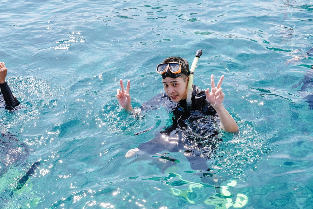 Trước khi được nếm hương vị các món ngon nơi đây, Quân A.P đã bị “chủ xị” Trường Giang “dụ dỗ” tham gia vào thử thách không hề đơn giản. Lần đầu tiên, nam ca sĩ đã được trải nghiệm lặn biển ở độ sâu 6 - 7m để bắn cá. Anh còn được ngư dân hướng dẫn tận tình cách câu cá bằng dây cước cực thú vị. Trong thử thách đi bắn cá, chàng ca sĩ đã được tận hưởng niềm vui ngắm san hô, “đạp chân vịt” khá là “trầy da tróc vảy”.