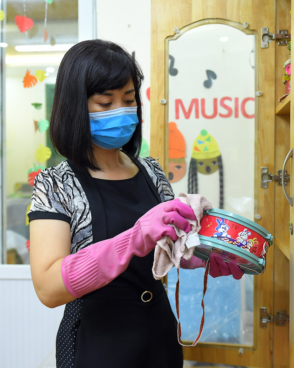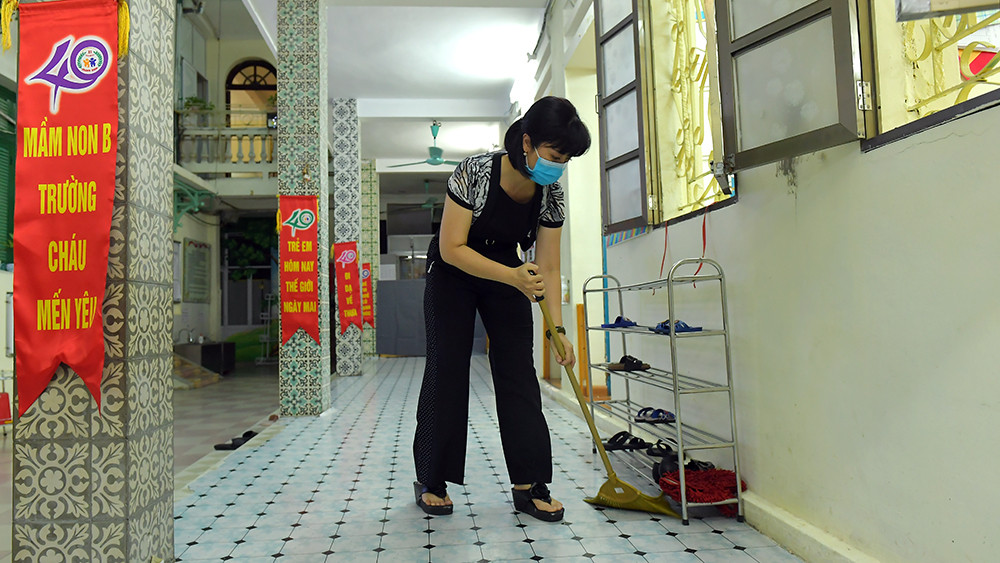 Các cô giáo tất bật dọn dẹp để chuẩn bị đón học sinh khai giảng năm học mới.