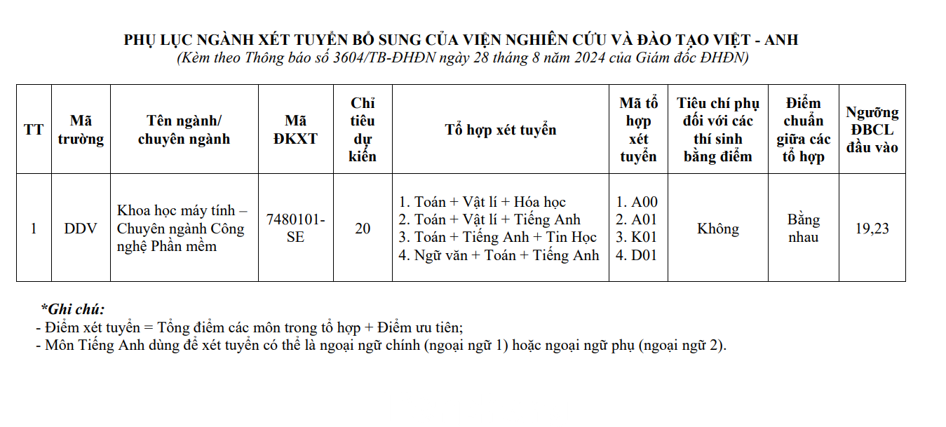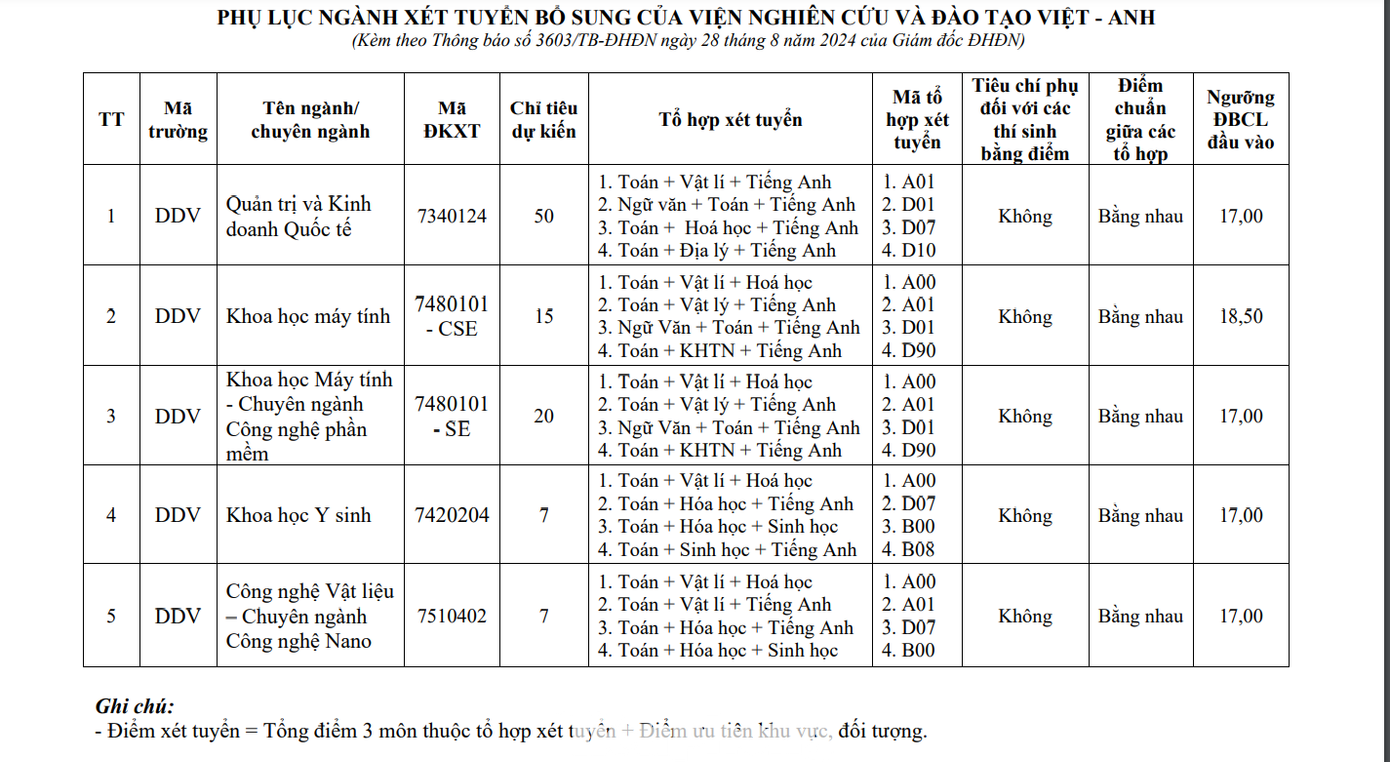 Hiện chỉ có một đơn vị duy nhất tuyển bổ sung là Viện Nghiên cứu và Đào tạo Việt - Anh (Viện VNUK).