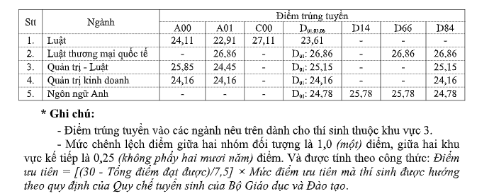 Điểm trúng tuyển trung bình tính theo các lĩnh vực đào tạo của Trường: Kinh tế (25,89 điểm), Kinh doanh (26,04 điểm), Luật (25,32 điểm).