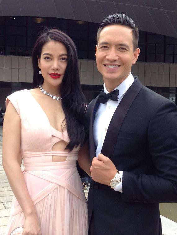 Nữ diễn viên mặc đầm dạ hội màu hồng cắt xẻ vòng một táo bạo, trong khi đó Kim Lý bảnh bao và lịch lãm với trang phục vest.