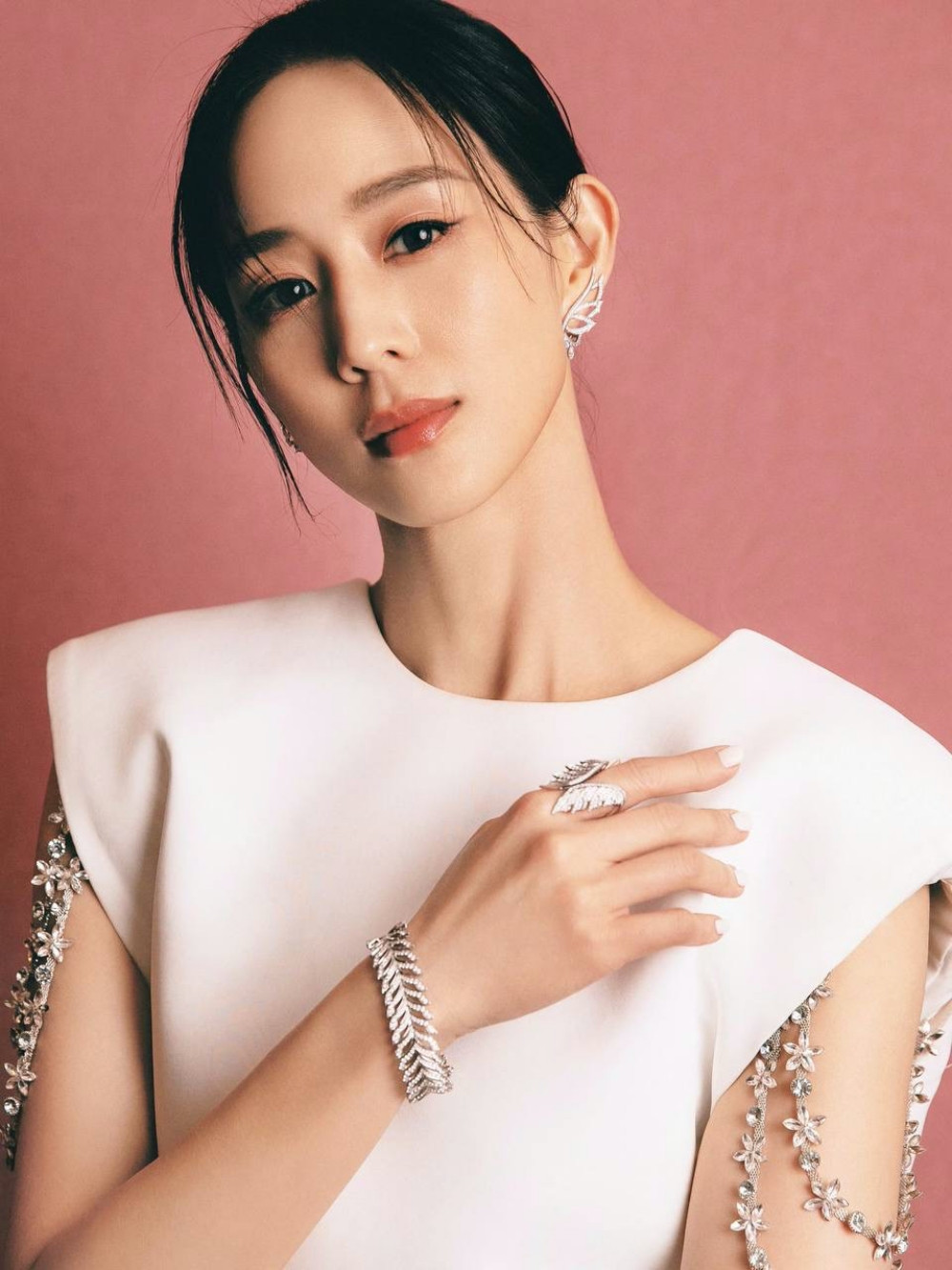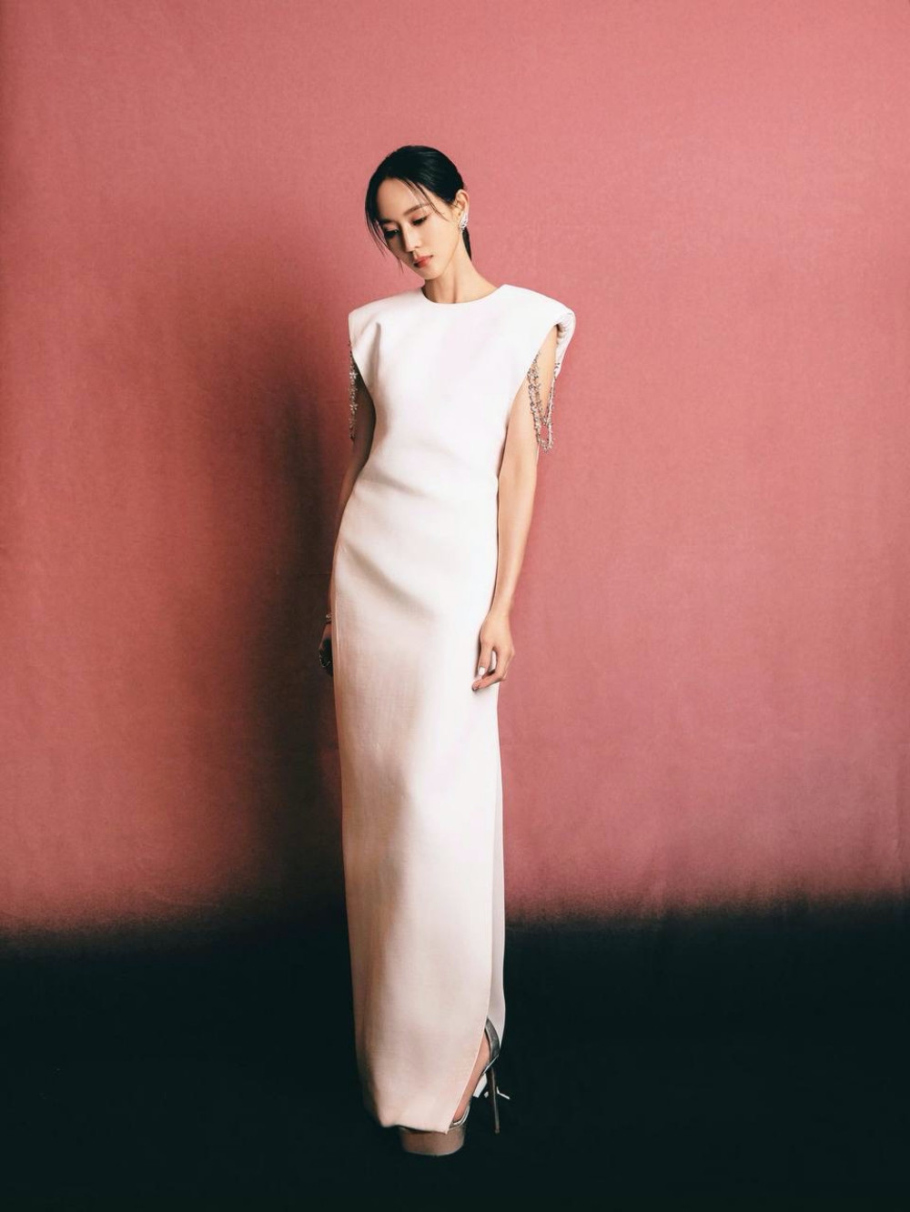 Thiết kế được may từ chất liệu vải cao cấp, phom dáng cứng cáp cùng các chi tiết cắt xẻ táo bạo, điểm xuyết dây đá lấp lánh. Mỹ nhân Như Ý Truyện lựa chọn tóc búi gọn gàng, đơn giản, trang điểm nhẹ nhàng nhưng tạo được chiều sâu cho gương mặt với trang sức ánh bạc