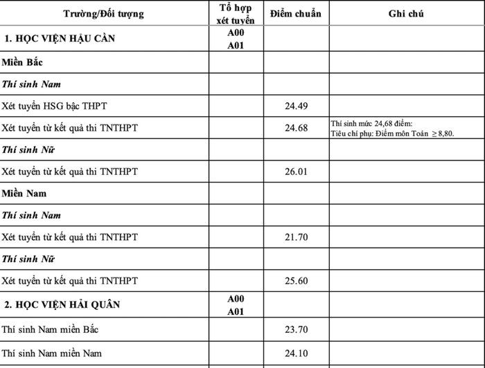 Một số trường có điểm chuẩn trúng tuyển xét theo điểm thi tốt nghiệp THPT năm 2023 ở mức cao như: Học viện Khoa học Quân sự, ngành Ngôn ngữ Trung Quốc, tuyển thí sinh nữ điểm chuẩn trúng tuyển 27,97 điểm; Học viện Biên Phòng, ngành Luật học tuyển thí sinh miền Bắc, điểm chuẩn trúng tuyển là 27,47 điểm; ngành Biên phòng, tuyển sinh tổ hợp C00 (Văn, Sử, Địa), điểm chuẩn với thí sinh miền Bắc là 26,99 điểm. Học viện Hậu cần, thí sinh ở miền Bắc, điểm trúng tuyển là 26,01 điểm đối với thí sinh nữ và 25,6 điểm đối với thí sinh nữ ở miền Nam...