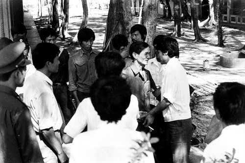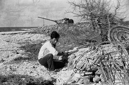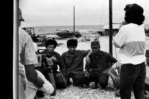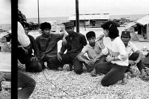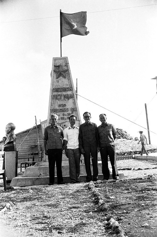Chụp ảnh kỷ niệm ở bia chủ quyền. Năm 1988 đảo Trường Sa lớn hầu như chưa có công trình xây dựng đáng kể nào, khung cảnh vẫn còn rất hoang sơ
