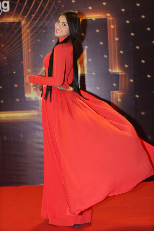 Tối 23/12, Á hậu Trương Thị May với bộ áo dài đỏ rực đã tham dự buổi tiệc mừng Noel và năm mới. Cô xứng đáng với danh hiệu “Nữ hoàng đơn sắc” trong năm qua khi liên tục lăng xê mốt ăn mặc này.