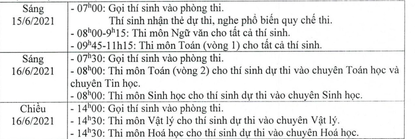 Theo đó, kỳ thi tuyển sinh vào lớp 10 của trường THPT chuyên Khoa học Tự nhiên, trường Đại học Khoa học Tự nhiên, Đại học Quốc gia Hà Nội diễn ra vào ngày 15 - 16/6 với điều kiện đảm bảo an toàn phòng chống dịch COVID-19 và nếu từ nay đến ngày 15/6, tình hình dịch bệnh không có diễn biến phức tạp hơn so với hiện nay.