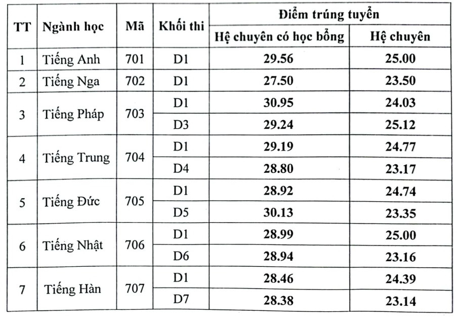 Theo đó, điểm chuẩn của Trường THPT Chuyên Ngoại ngữ dao động từ 23,14 điểm đến 25 điểm.