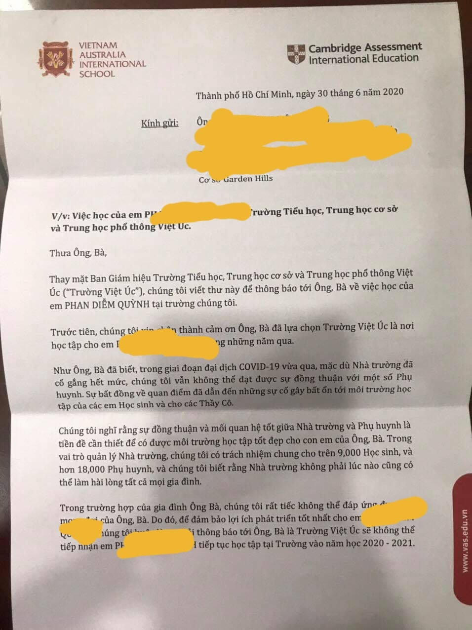 Trong khi đó, ngày 4/7, VAS đã có phản hồi với Tiền Phong xung quanh việc “không thể tiếp tục tiếp nhận một số học sinh trong năm học 2020- 2021”. Theo VAS, có khoảng 40 gia đình nhận được thông báo này.
