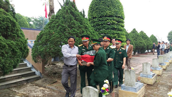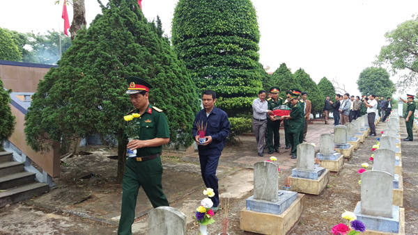 Trong không khí trang nghiêm và xúc động, các đồng chí lãnh đạo, cùng cán bộ, nhân dân, LLVT huyện Hướng Hóa đã dâng hương, đặt vòng hoa bày tỏ lòng kính trọng và biết ơn sâu sắc trước vong linh các anh hùng liệt sĩ. 9 hài cốt liệt sĩ truy điệu và an táng lần này được Đội tìm kiếm - quy tập Hài cốt Liệt sĩ, Đoàn KT- QP 337 tiến hành tìm kiếm, cất bốc tại xã Hướng Linh, xã Tân Hợp và thị trấn Khe Sanh, huyện Hướng Hóa. Trong số những hài cốt liệt sĩ được tìm thấy, có 4 liệt sĩ có ghi tên, đơn vị chiến đấu; các hài cốt được bọc trong tăng nilon cùng với các di vật đi kèm như thắt lưng, đế giày, cúc áo,…