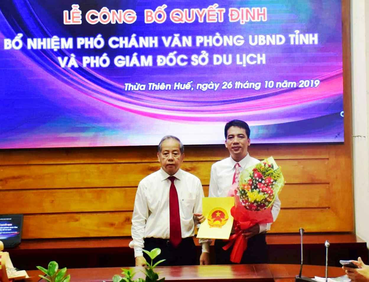 Theo đó, ông Phan Lê Hiến, Phó Giám đốc Ban Quản lý Dự án Đầu tư Xây dựng Dân dụng và Công nghiệp tỉnh TT-Huế, được điều động đến công tác và bổ nhiệm giữ chức vụ Phó Chánh Văn phòng UBND tỉnh TT-Huế từ ngày 1/11/2019 đến 21/10/2024; ông Trần Hữu Thùy Giang, Trưởng phòng Phòng Tuyên truyền - Báo chí - Xuất bản (Ban Tuyên giáo Tỉnh ủy TT-Huế) được tiếp nhận đến công tác tại Sở Du lịch và bổ nhiệm giữ chức vụ Phó Giám đốc Sở Du lịch TT-Huế kể từ ngày 1/11/2019 đến 21/10/2024.