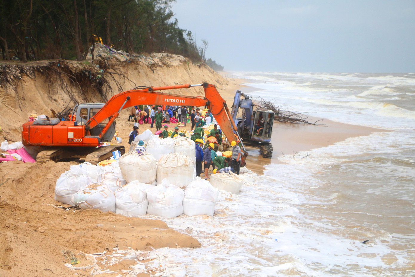 | Lực lượng biên phòng TT-Huế được huy động cứu bờ biển sạt lở. |