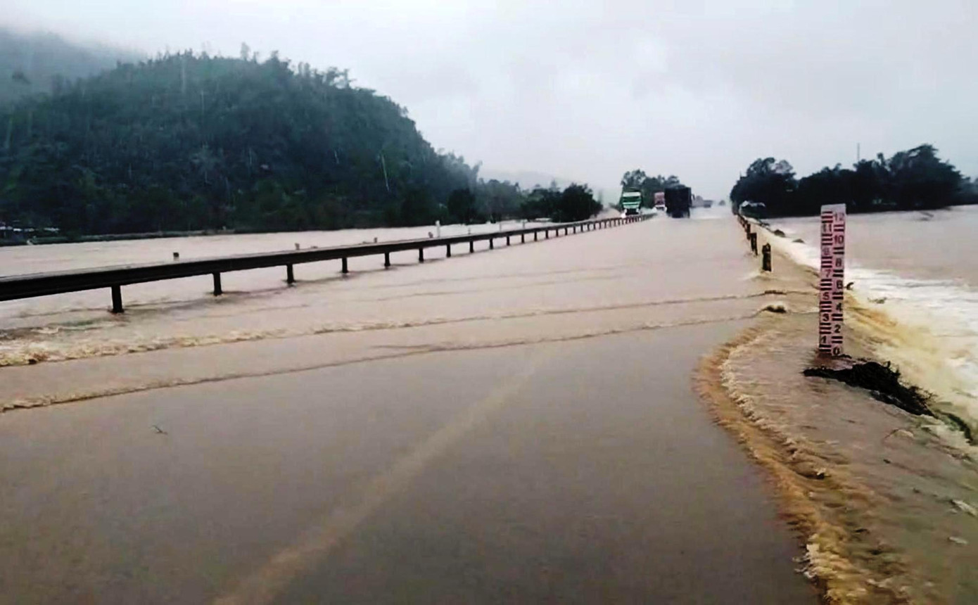 Mưa lớn ở mức hơn 500mm đã khiến đoạn Quốc lộ 1 (vị trí Km882+600 đến 882+800) qua địa phận xã Lộc Tiến (huyện Phú Lộc) bị ngập lụt, nước dâng cao 15cm chảy tràn qua mặt đường.
