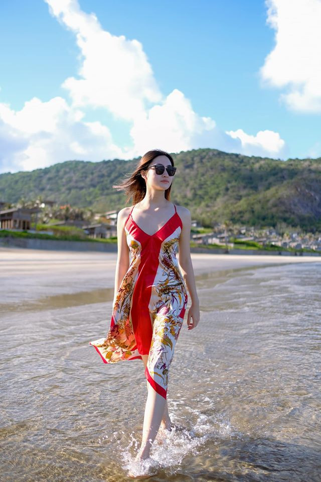 Miss World Vietnam 2019 khoe vóc dáng gợi cảm trên biển với bộ váy hai dây nữ tính. Thiết kế giúp cô khoe được vòng một gợi cảm và làn da trắng nõn không tì vết.