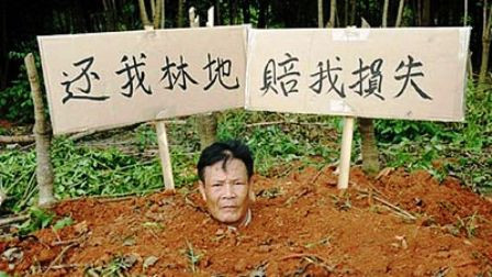 Một người đàn ông ở Trung Quốc đã quyết định tự đào hố chôn mình dưới đất chỉ trừ phần đầu để phản đối việc chính quyền phá hoại cây rừng, chiếm đất làm nhà.