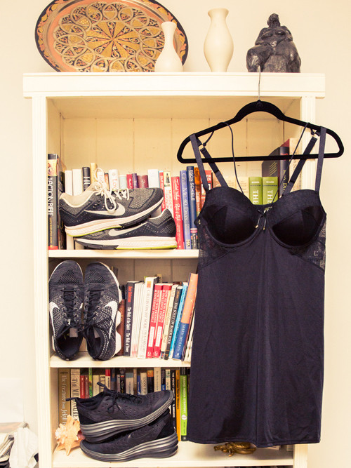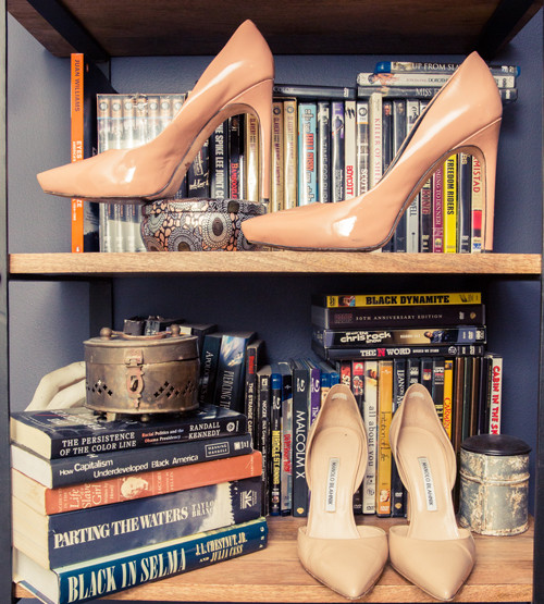 Trên giá sách, người mẫu béo trang trí bằng những đôi giày màu nude bóng từ Miu Miu và Manolo Blahnik.