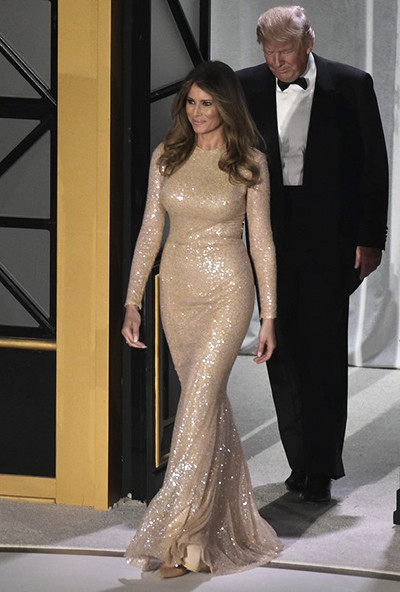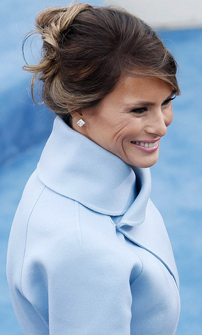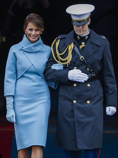 Xuất hiện trong lễ nhậm chức của Donald Trump hôm 20/1, Melania chọn bộ váy xanh da trời hiệu Ralph Lauren, kết hợp găng tay lụa xanh và giày cao gót cùng tông. Harper's Bazaar bình luận đệ nhất phu nhân Mỹ chọn màu xanh pastel này với ý nghĩa bày tỏ mong muốn được bình yên khi đảm nhận vị trí quyền lực mới, trước những phản đối của một bộ phận công chúng về việc Donald Trump đắc cử tổng thống.