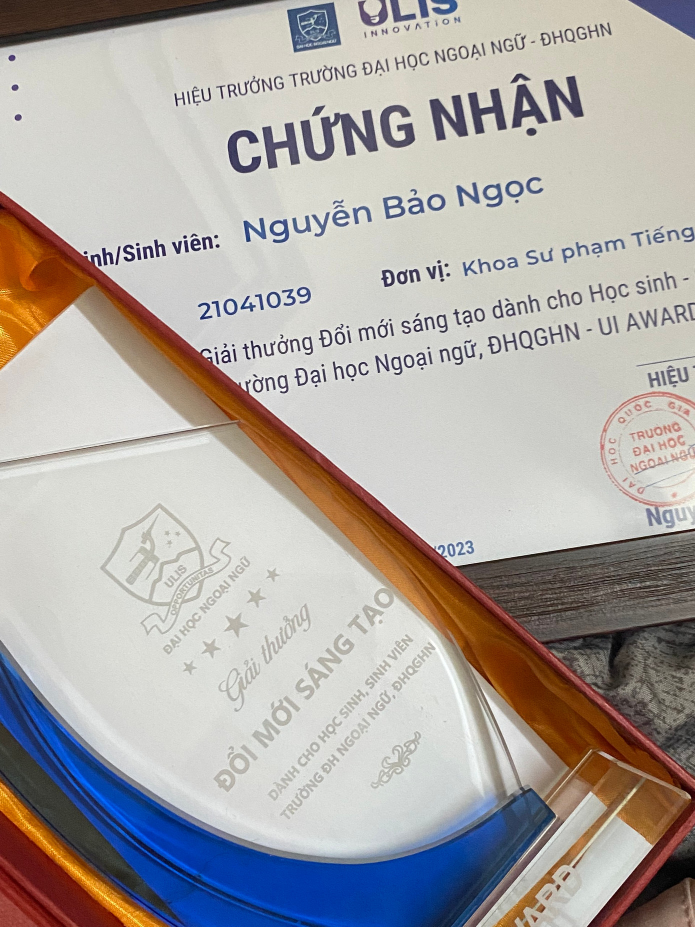 | Bảo Ngọc được vinh danh trên fanpage nhà trường, nhận chứng nhận và kỷ niệm chương giải thưởng Đổi mới sáng tạo ULIS INNOVATION. |
