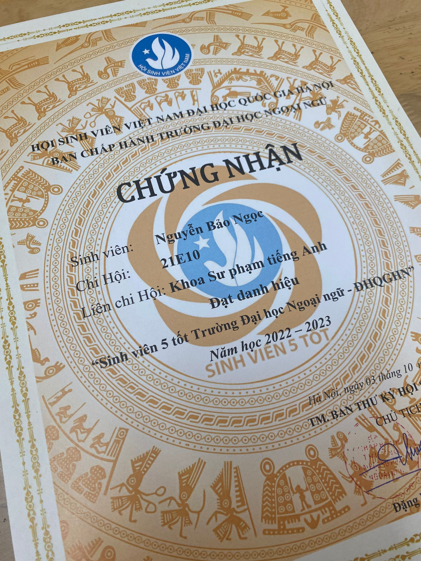 Đến nay, Ngọc nhận thấy bước chân vào cánh cửa Đại học và có trải nghiệm ở đây là điều tuyệt vời nhất trong tuổi trẻ của chính mình. Nhiều trải nghiệm đáng giá mà Ngọc nghĩ nếu không ở đây, sẽ không ở nơi nào khác có được. Ngọc thấy may mắn khi được là học trò của các thầy cô, được làm bạn và làm việc với nhiều bạn siêu giỏi. Bản thân cũng được thử sức mình với các cuộc thi và danh hiệu. Trong những ngày tới Ngọc và các bạn sẽ thật bận rộn cùng dự án ngôn ngữ kí hiệu chuẩn bị cho Chung kết ULIS FIRE 2024, và đây sẽ là một trong những dấu ấn tuổi trẻ không thể nào quên trong những năm tháng thanh xuân của Ngọc.