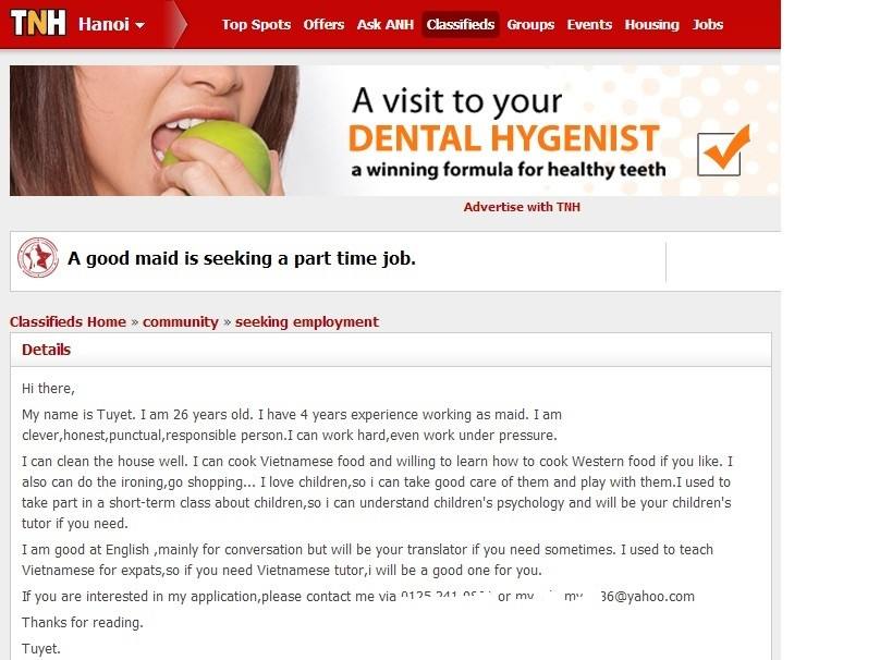 Một nghề dường như không hề liên quan đến văn phòng, ứng viên cũng lên mạng đăng thông tin cá nhân, giới thiệu kinh nghiệm làm việc và đặc biệt là khả năng ngoại ngữ... đó là nghề giúp việc cho Tây.