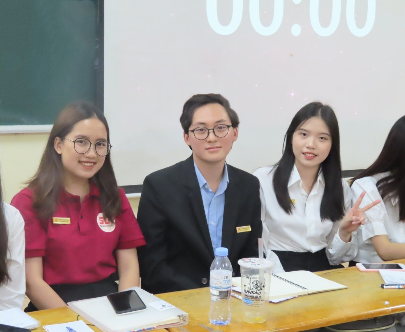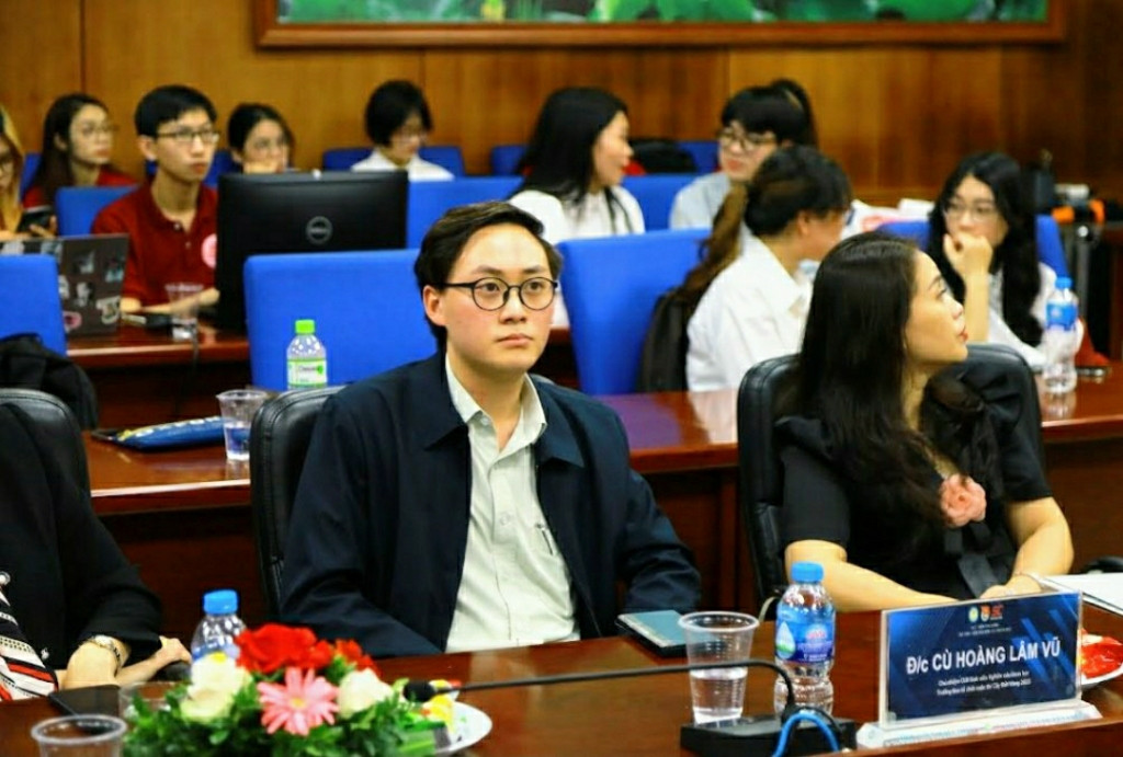 | Lâm Vũ trong một buổi thay mặt CLB Sinh viên NCKH cùng CLB Tài chính Công chủ trì tọa đàm Đẩy mạnh phong trào NCKH và sử dụng tiếng Anh trong NCKH. |