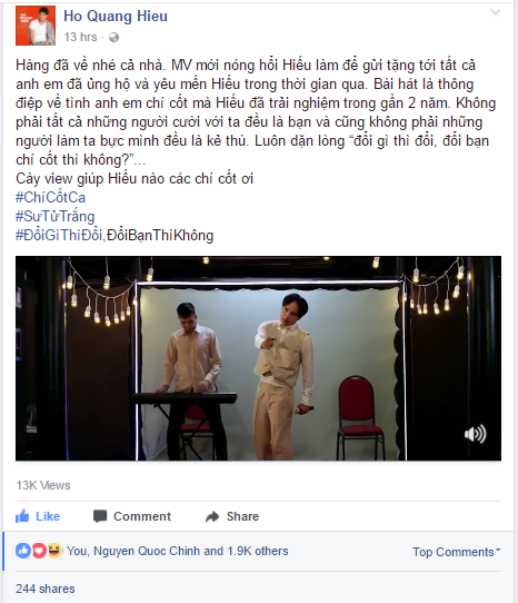 Hơn nữa ca sĩ Hồ Quang Hiếu đã chia sẻ những suy nghĩ của mình trên trang cá nhân nhân dịp giới thiệu MV "Chí cốt ca" chính thức phát hành "Đổi đời thì bạn, đổi bạn chí cốt thì không". Bên cạnh những ý kiến đồng tình và ủng hộ quan điểm trên, cũng có không ít bình luận gay gắt, chỉ trích nam ca sĩ.