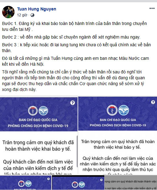 Cụ thể, nam ca sĩ đăng tải loạt ảnh chụp màn hình các bước khai báo y tế khi vừa về đến Việt Nam một cách trung thực. "Bước 1. Đăng ký và khai báo toàn bộ hành trình của bản thân trong chuyến lưu diễn tai Mỹ. Bước 2 : về đến nhà gặp bác sĩ chuyên ngành để xét nghiệm máu ngay. Bước 3: Không tiếp xúc hoặc đi lại lung tung khi chưa có kết quả chính xác về bản thân. Đó là tất cả những gì mà Tuấn Hưng cùng anh em ban nhạc Màu Nước cam kết khi về đến Hà Nội.