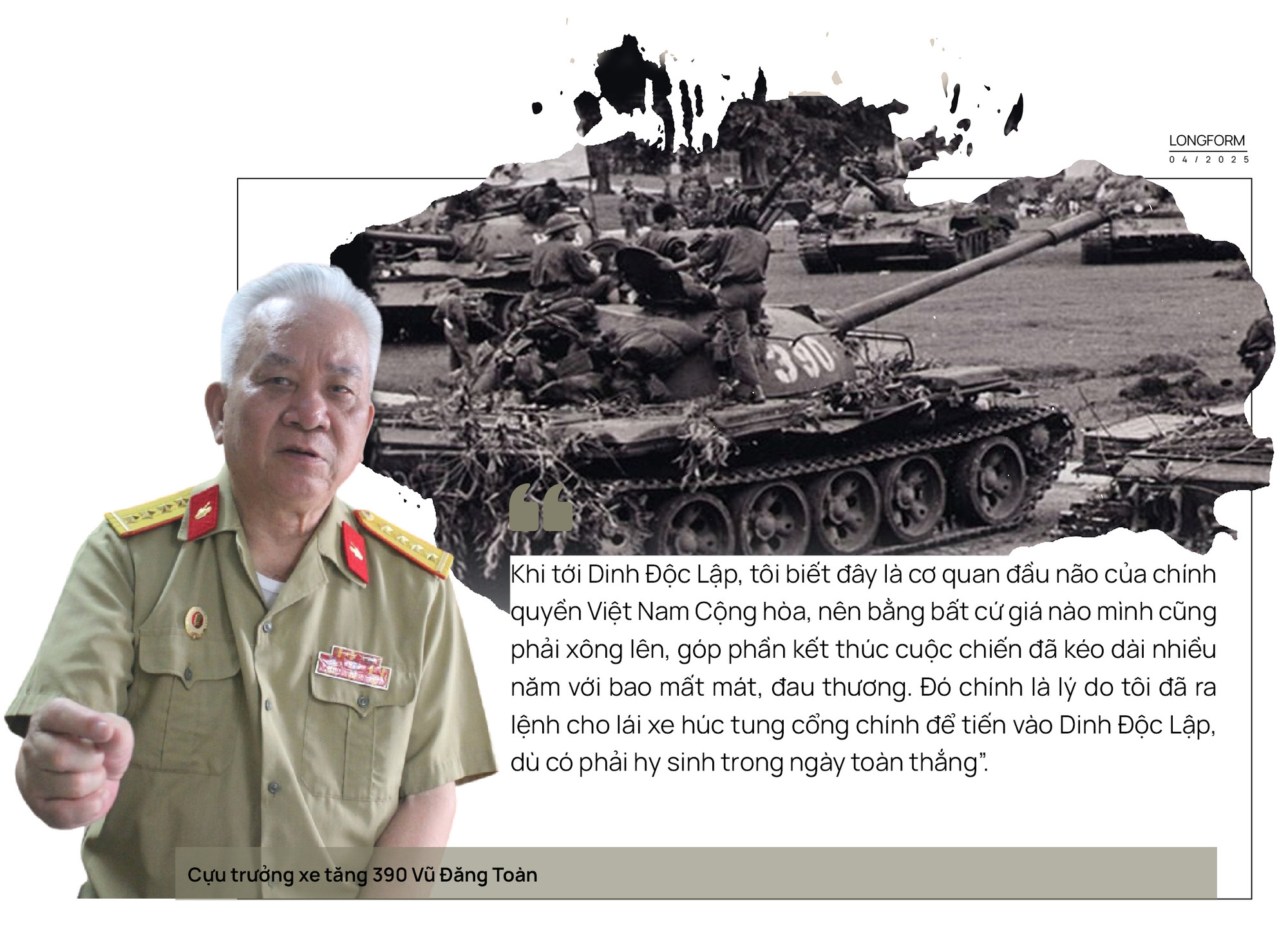CCB Vũ Đăng Toàn kể thêm, khi xe 390 dừng lại, ông định ra ngoài xe để cắm cờ, thì đại đội phó Lê Văn Phượng ngồi sau nhắc: “Đại đội trưởng đang cầm cờ ở phía sau”. Vũ Đăng Toàn ngoảnh lại, thấy trưởng xe tăng 843 Bùi Quang Thận đã rời khỏi xe, cầm cờ chạy vào Dinh. Thấy vậy, chính trị viên Toàn vội lấy khẩu AK, mở cửa nhảy ra, nói: “Tôi đi theo để yểm hộ cho anh Thận”.