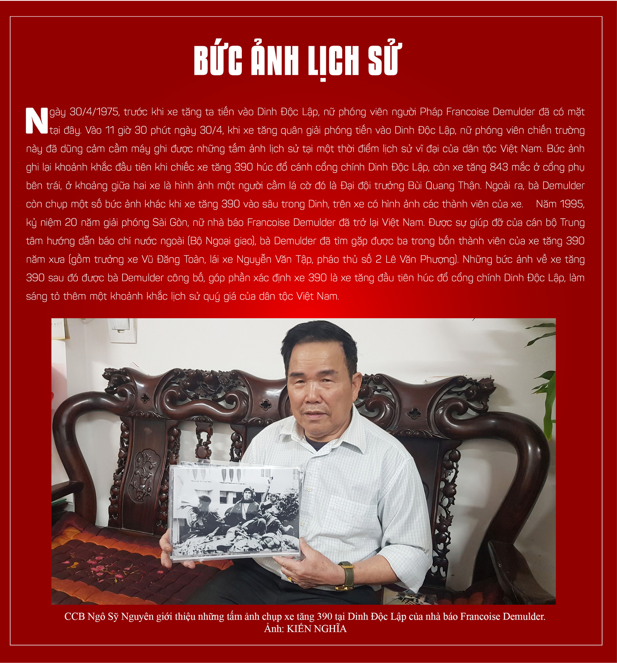 | Xe tăng 390 tại Dinh Độc Lập ngày 30/4/1975, lái xe Nguyễn Văn Tập ngồi phía trước nhô đầu khỏi xe, pháo thủ Ngô Sỹ Nguyên nhô người trên tháp pháo xe tăng Ảnh: FRANCOISE DEMULDER |