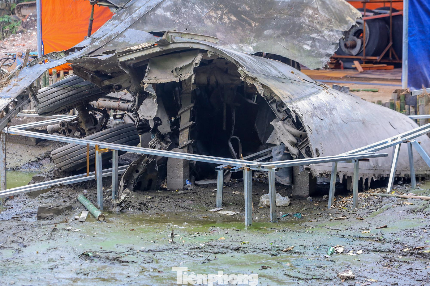 Theo ghi nhận của PV, xung quanh hồ Hữu Tiệp đã được quây bạt, dưới hồ có 2 máy cẩu thực hiện nạo vét bùn. Xác máy bay B52 được giữ nguyên và đặt trên khung sắt đỡ.