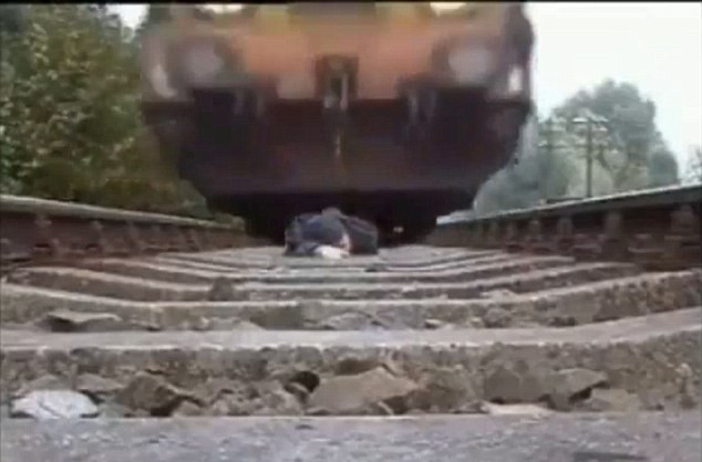 Clip quay cảnh người đàn ông mặc bộ đồ màu đen, đi giày đen, trùm mũ áo lên đầu, đặt camera giữa đường ray rồi nằm xuống chờ tàu hỏa tới. Ngay sau đó, một đoàn tàu hỏa lao tới, làm rung chuyển đường ray và chạy qua người anh ta. Rất may mắn cho gã khùng này vì không có tai nạn nào đáng tiếc xảy ra.