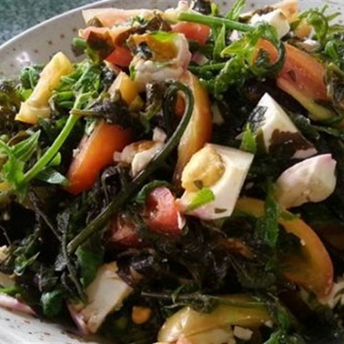 Salad rau trứng muối. Nguyên liệu gồm rau dớn, cà chua, muối, quất, gia vị. Rau dớn rửa sạch, cà chua bổ múi cau, trứng muối luộc chín và thái hạt lựu to. Quất vắt lấy nước. Ảnh: Cooky.