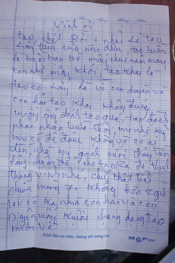 Anh Phong cho PV xem hai bức thư do ông Thái viết để lại với nét chữ nguệch ngoạc. Một lá gửi cho ông Vinh người bị mất tiền và một gửi công an huyện Nông Sơn kêu oan. Trong thư gửi cho ông Vinh, ông Thái viết: “Tao chết rồi không phải vì tao lấy tiền của mi đâu. Tao buồn là bạn bè mấy chục năm tan như mây khói…Mấy ông đánh tao quá, tao phải nhận bừa…”.