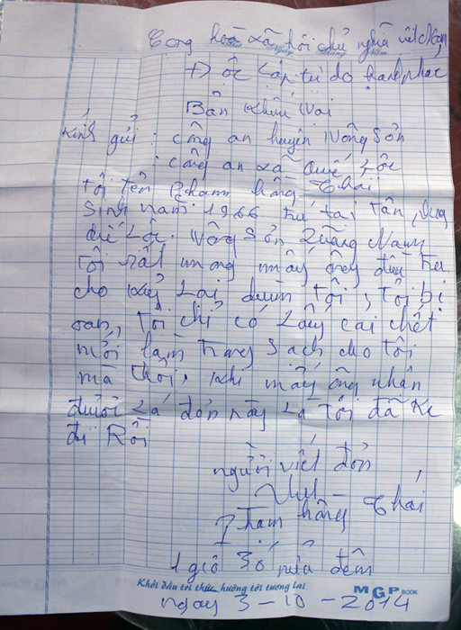 Trong bức thư gửi Công an huyện Nông Sơn và Công an xã Quế Lộc, ông Thái viết ngắn gọn: “Tôi mong mấy ông điều tra lại cho kỹ giùm tôi, tôi bị oan tôi chỉ biết lấy cái chết làm trong sạch cho tôi mà thôi. Khi mấy ông nhận lá đơn này là tôi đã ra đi rồi”.