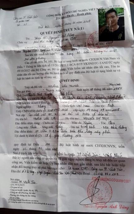 Công an TP. Vĩnh Yên kêu gọi đối tượng Hoàng Văn Trung ra đầu thú để được hưởng lượng khoan hồng của pháp luật.
