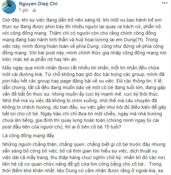 Mặc dù vụ việc chưa có kết luận cuối cùng nhưng mới đây, chia sẻ trên trang cá nhân, MC Diệp Chi bày tỏ rằng cô đứng hoàn toàn về bé Thùy D trong vụ việc, cũng như cộng đồng mạng, bởi nhờ sức ép của dư luận mà mọi người mới biết được những hành động của Minh Tiệp đối với bé Thùy D.
