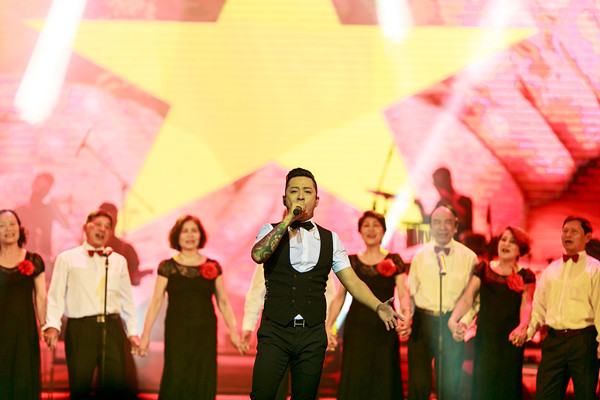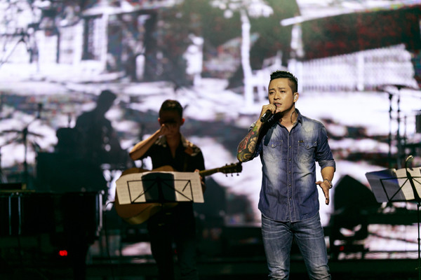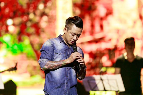 Khép lại đêm nhạc, nam ca sĩ chọn hát "Nối vòng tay lớn" với dàn hợp xướng, như một lời nhắn nhủ về tình yêu quê hương, đất nước.